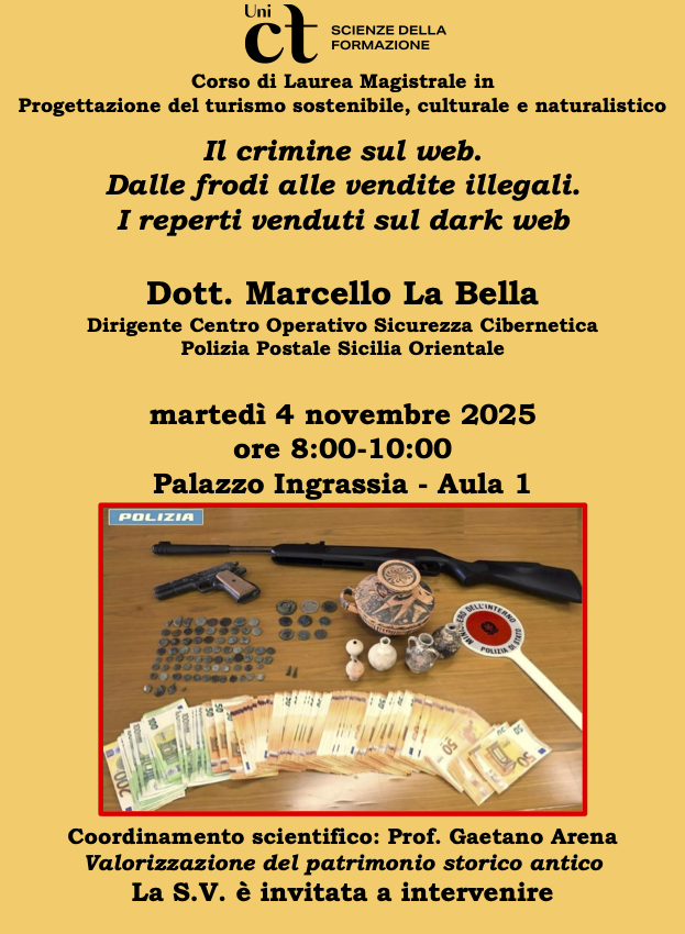 Il dott. Marcello La Bella, Dirigente del Centro Operativo Sicurezza Cibernetica Polizia Postale Sicilia Orientale, esperto di crimine informatico, tutela dei dati e violenza online, affronterà i delicati temi della compravendita illegale dei beni archeologici sul dark web e del traffico illecito di opere d’arte in connessione con gli investimenti economici delle criminalità organizzate.