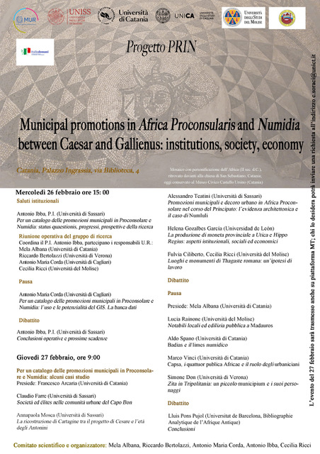 Il workshop dal titolo “Municipal promotions in Africa Proconsularis and Numidia between Caesar and Gallienus: institutions, society, economy” rappresenta una delle tappe dell'omonimo progetto PRIN 2022. Le cinque unità di ricerca coinvolte nel progetto (Università di Sassari, di Cagliari, di Catania, del Molise, di Verona) esploreranno il processo di municipalizzazione nelle province romane di Numidia e Africa Proconsolare durante l'età imperiale, in un momento aperto al dialogo con studiosi di altre università e centri di ricerca. Il confronto tra politica imperiale e iniziative locali consentirà di valutare la portata dell'estensione della cittadinanza romana e l'impatto di questa forma di romanizzazione sulle realtà e culture provinciali.