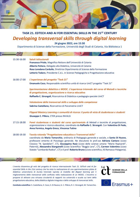 L’evento dissemina gli esiti del progetto di ricerca internazionale Task 21. EdTech and AI for essential Skills in the 21st century che ha visto la realizzazione di una sperimentazione pilota di didattica universitaria di durata triennale ispirata al modello del flipped learning per il miglioramento delle transversal skills confluita nella realizzazione di un MOOC. L’incontro, che vedrà tra i partecipanti studentesse e studenti universitari del corso sperimentale e docenti delle scuole secondarie di secondo grado della provincia di Catania, si propone di attivare una virtuosa circolarità di rapporti tra università e scuola sui temi della progettazione educativa, della didattica digitale integrata e dello sviluppo di transversal skills.