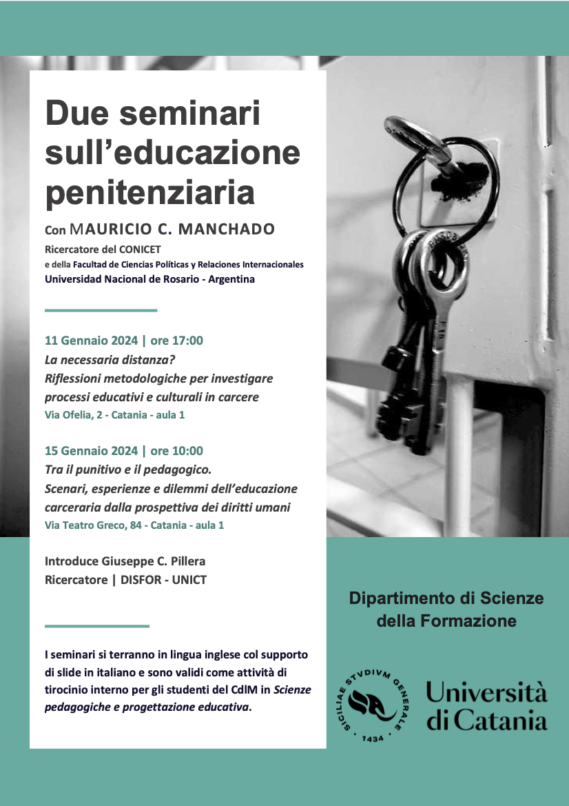 I due seminari sul tema dell’educazione in contesto penitenziario verranno tenuti dal dott. Mauricio C. Manchado, ricercatore del CONICET (Consejo Nacional de Investigaciones Científicas y Técnicas) e della Facultad de Ciencias Políticas y Relaciones Internacionales dell’Universidad Nacional de Rosario (Argentina).