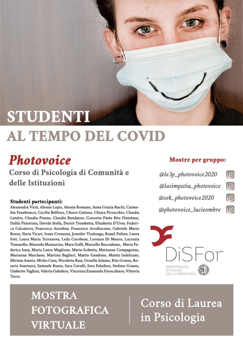Gli studenti del corso di Psicologia di Comunità e delle Istituzioni (Corso di Laurea Magistrale in Psicologia) hanno partecipato ad un progetto di photovoice sul tema “Studenti al tempo del Covid”, oltre alla mostra generale, le cui foto sono presentate in questa pagina, ogni gruppo ha deciso di creare una pagina instagram in cui verranno inserite le foto che sono state escluse dalla mostra. Qui sotto i link agli account dei singoli gruppi.