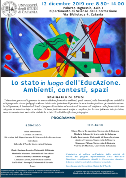 Giovedì 12 dicembre 2019, dalle ore 8.30 alle 14.00, presso l'aula 1 di Palazzo Ingrassia, si svolgerà il Seminario di Studi "Lo stato in luogo dell'EducAzione. Ambienti, contesti, spazi". L’iniziativa si colloca nell’ambito delle attività di ricerca del progetto dipartimentale FIRD 2017-2019 EducAzione e cambiamento. Modelli per l’innovazione educativo- didattica, sviluppo sostenibile, istituzioni scolastiche (Coordinamento Scientifico: Gabriella D'Aprile).