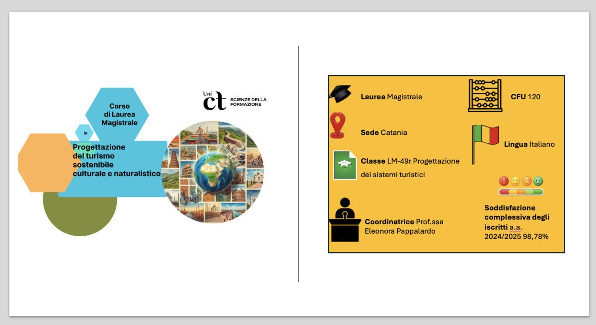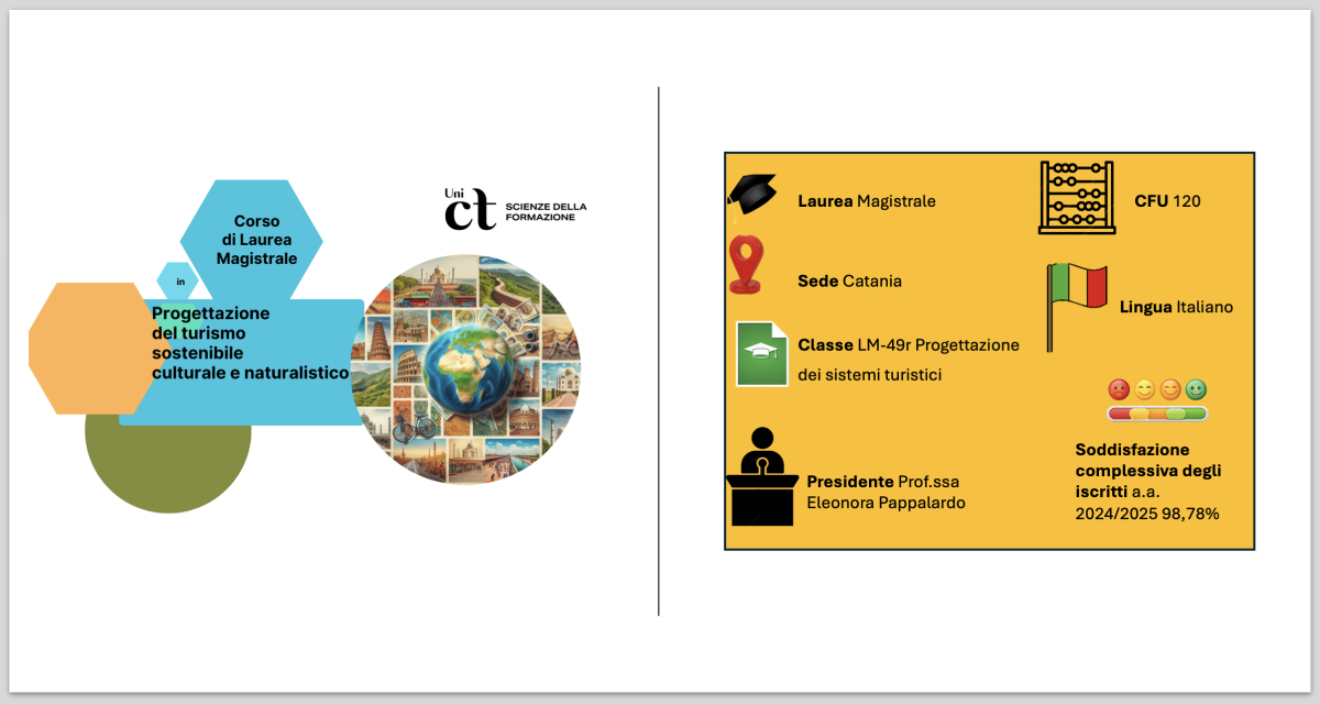 Il Corso di laurea magistrale (CdLM) in “Progettazione del turismo sostenibile culturale e naturalistico” del Dipartimento di Scienze della Formazione è un CdLM della classe LM-49 (Progettazione e gestione dei sistemi turistici) non presente all’Università di Catania, che garantisce il completamento del percorso formativo del già attivo CdS in Scienze del Turismo (L-15), offrendo agli studenti l’opportunità di affinare competenze attraverso una formazione più specialistica, in linea con l’attuale programmazione europea basata sui principi di sostenibilità. Esso propone il conseguimento degli obiettivi formativi qualificanti della classe LM-49 di cui alle tabelle allegate al D.M. n. 1648 del 19/12/2023 (“Determinazione delle classi delle Lauree universitarie”), integrati e declinati secondo specificità dettate dall’analisi aggiornata delle richieste del mercato del lavoro.