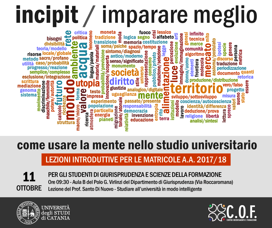 Anche quest'anno si terrà la lezione INCIPIT - Imparare meglio - Come usare la mente nello studio universitario (dedicata alle matricole) che per il nostro dipartimento, insieme a quello di Giurisprudenza e nella sede di via Roccaromana, sarà tenuta dal direttore prof. Di Nuovo l'11 ottobre alle ore 9,30.