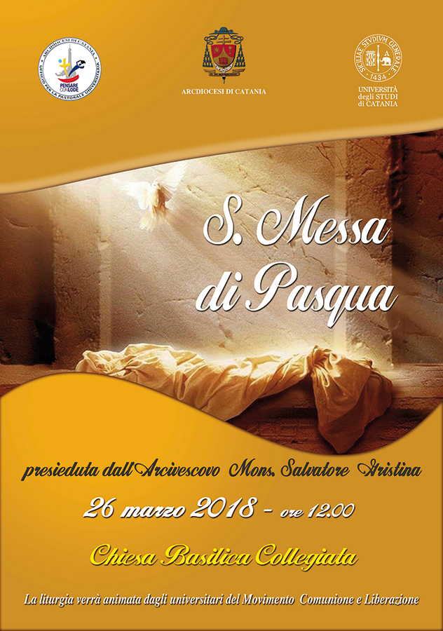 Lunedì 26 marzo alle 12, nella Basilica Collegiata di Catania (via Etnea, 23), l'arcivescovo di Catania, mons. Salvatore Gristina, celebra la Messa di Pasqua per la comunità universitaria catanese. La liturgia sarà animata dagli universitari del Movimento Comunione e Liberazione.