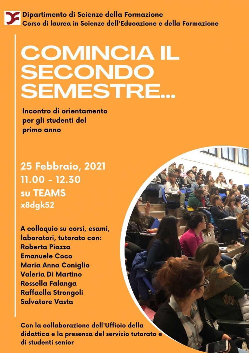 Il CdS L-19 intende sostenervi al vostro ingresso nel secondo semestre. Pertanto ha organizzato un incontro di orientamento, in modo da chiarire eventuali dubbi e rispondere a domande su corsi, esami, frequenza, laboratori.....