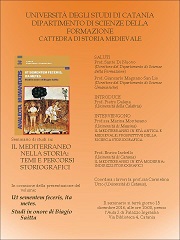 presso il Dipartimento di Scienze della Formazione (aula 2 di Palazzo Ingrassia, via Biblioteca 4), si terrà il Seminario di studi su "Il Mediterraneo nella storia: temi e percorsi storiografici". L'incontro si propone di evidenziare, all'interno di un ampio arco cronologico che spazia dall'età antica a quella moderna, i più recenti indirizzi della ricerca storiografica sui caratteri politici, economici, sociali e culturali della civiltà mediterranea. Il Seminario è organizzato in occasione della presentazione del volume "Ut sementem feceris, ita metes. Studi in onore di Biagio Saitta" (già professore ordinario di Storia medievale presso il Dipartimento di Scienze Umanistiche dell'Università di Catania). Saranno presenti il prof. Santo Di Nuovo, Direttore del Dipartimento di Scienze della Formazione, e il prof. Giancarlo Magnano San Lio, Direttore del Dipartimento di Scienze Umanistiche. Il seminario verrà introdotto dal prof. Pietro Dalena (Università della Calabria), seguiranno gli interventi della prof.ssa Marina Montesano (Università di Messina) e del prof. Enrico Iachello (Università di Catania). Coordina i lavori la prof.ssa Carmelina Urso (Università di Catania).