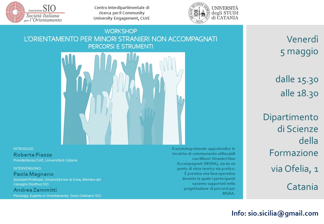 Il workshop intende approfondire le tecniche di orientamento utilizzabili con Minori Stranieri Non Accompagnati (MSNA), sia da un punto di vista teorico sia pratico. E' prevista una fase operativa durante la quale i partecipanti saranno supportati nella progettazione di percorsi per MSNA. Introduce il workshop la prof.ssa Roberta Piazza (Presidentessa CUrE, Università di Catania) e saranno presenti, in qualità di relatori, la prof.ssa Paola Magnano (Assistant Professor, Università Kore di Enna, Membro del Consiglio Direttivo della Società Italiana per l'Orientamento) e il dott. Andrea Zammitti (Psicologo, Esperto in Job Placement, Socio Ordinario della Società Italiana per l'Orientamento).