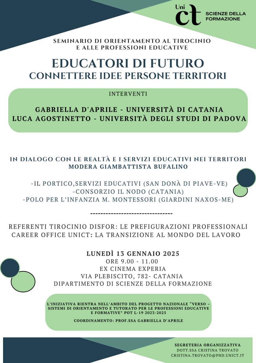Il 13 gennaio 2025, dalle ore 9.00 alle ore 11.00, presso l'Ex Cinema Experia (Via Plebiscito, 782, Catania), si terrà il seminario di avvio e orientamento al tirocinio e alle professioni educative, organizzato dal Corso di laurea in Scienze dell'educazione e della formazione.